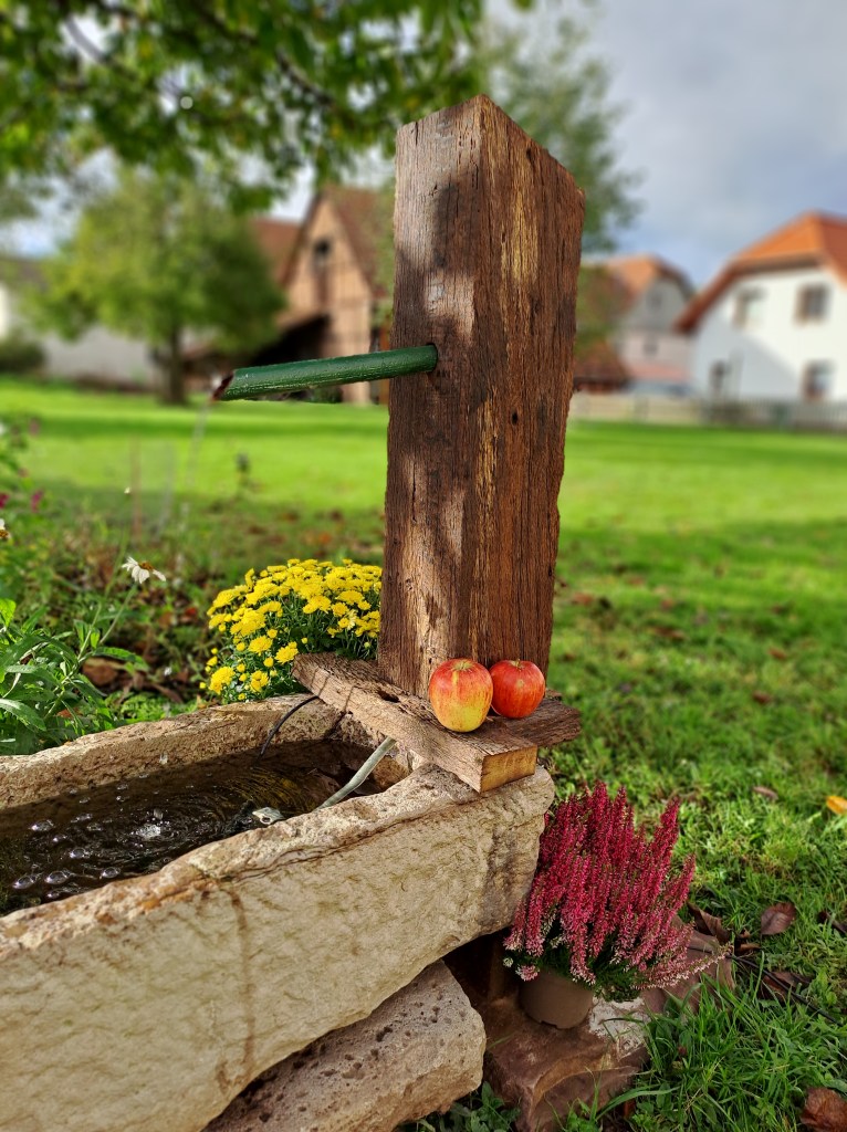 - Steintrogbrunnen mit Brunnenkopf aus antiken Eichenbalken